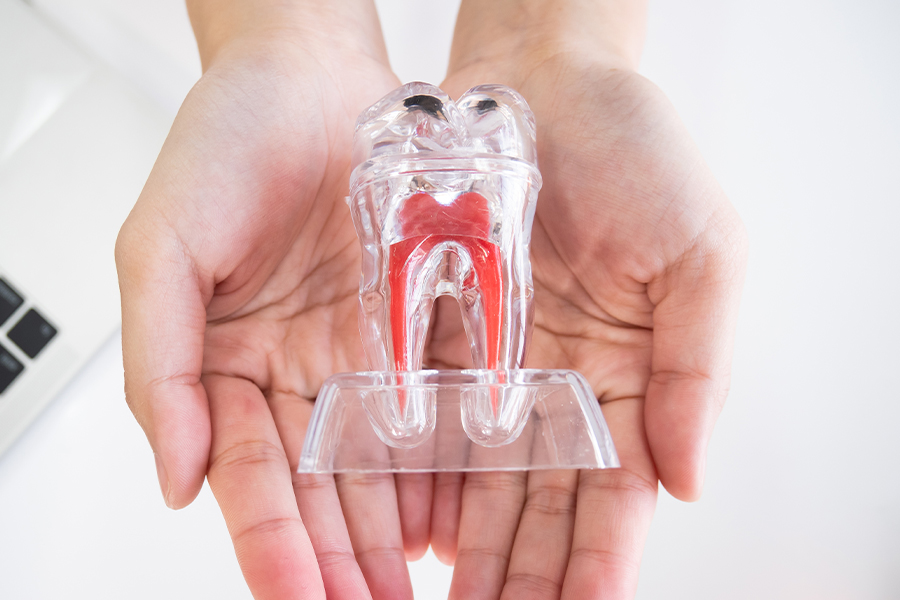 根管治療の後に歯に物が当たると痛かったり、噛むと痛かったりすることがあります。歯の根の周りには、噛んだ時に硬い物や軟らかいものを判断する歯根膜という薄いクッションがあります。根の先からこの歯根膜に炎症が伝わると咬合時に痛みが出ます。