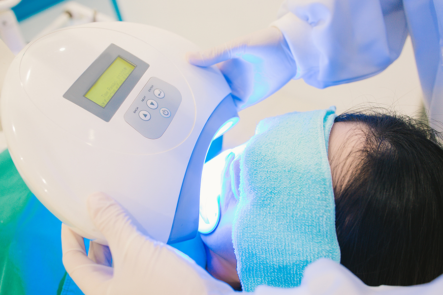歯科医院にて漂白を行う方法です。歯の表面に高濃度の薬液を塗布し、光を照射して歯の着色成分を変化させることで黄ばみを改善する方法です。