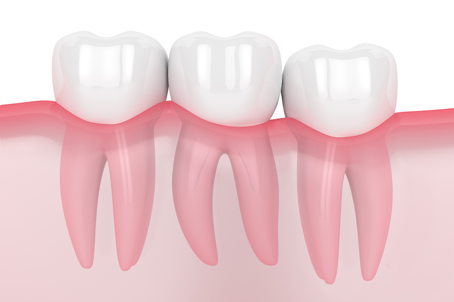 親知らずが横を向いて埋まっていて隣の歯が虫歯になったり、清掃性が悪いために炎症を起こして腫れてしまうリスクが高いため、抜歯をした方が良いケースです。親知らずと神経が近い場合は、安全のためにCT撮影をして位置関係を確認します。